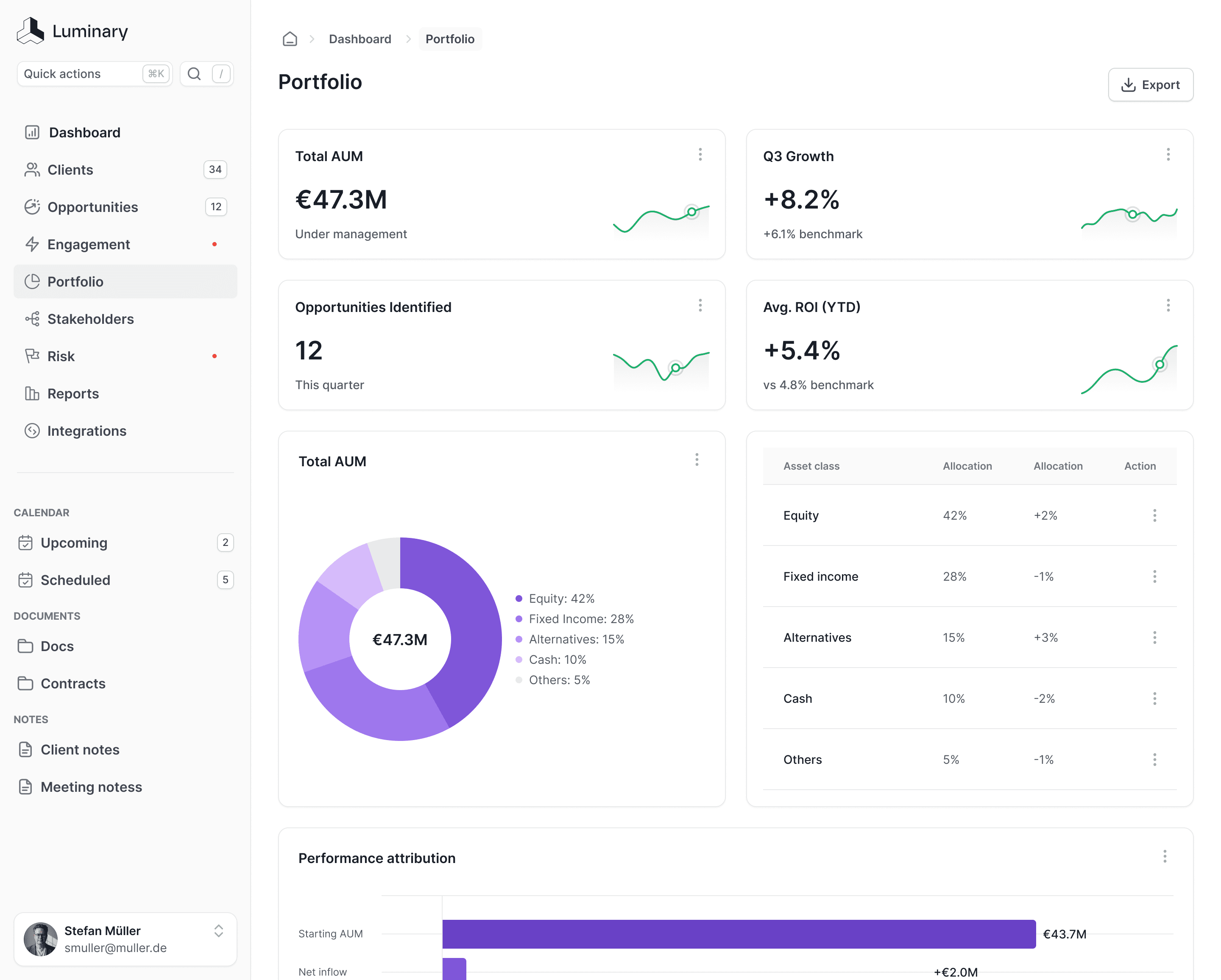 Luscent aggregates portfolio data across custodians and banking systems, providing comprehensive insights into holdings, performance attribution, and AI-powered rebalancing opportunities that are directly informed by intelligence from client communications.